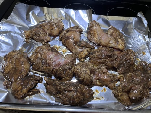 - Cover an extra large sheet pan with foil, take the chicken out of the fridge and spread the chicken thighs on the pan.