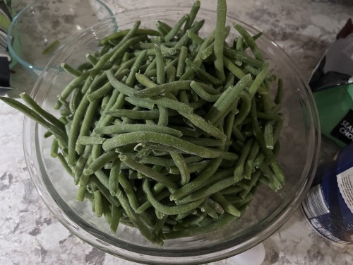 - Empty both bags of frozen green beans in a large bowl and drizzle with 1/4 cup olive oil plus 2 tsp. salt. Use your hands or a spoon to stir it around.