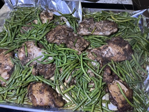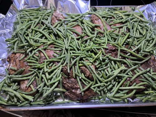 - Add the green beans around the chicken on the pan (it’s OK if some of the beans cover the chicken a little), and place the pan in the oven.