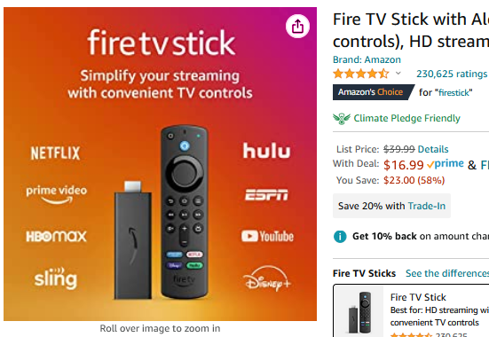 Prime Members Fire TV Stick with Alexa Voice Remote (includes TV controls), HD streaming device $16.99
