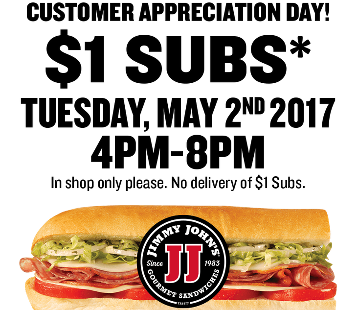 Jimmy John’s– $1 Subs from 4PM-8PM on 5/2 for Customer Appreciation Day.