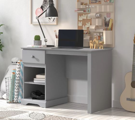 This desk has great reviews and includes a drawer and two storage shelves. Grab it in gray or white!
