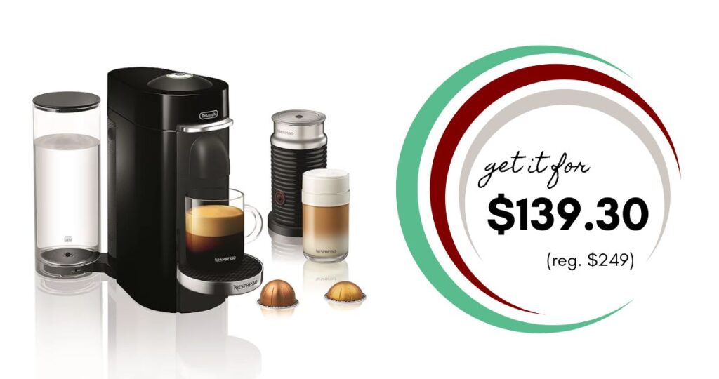 Nespresso Vertuo Plus Deluxe Coffee & Espresso Machine with Aeroccino Milk Frother by Delonghi – $139.30 (reg. $249)