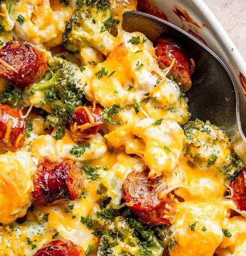 Cheesy Broccoli, Sausage, and Cauliflower Casserole