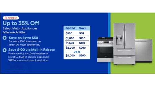 Plus, you can get additional money off your LG appliance purchase – $50 off $500, $100 off $1,000, etc. Save up to $500! Discount applies automatically in your cart, and is off your total purchase. Save even more when you buy the whole set!
