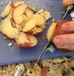Boil whole potatoes until they are fork tender (12-15 minutes depending on the size of potatoes). You can prewash if you want, or let the boiling water do the work for you. Remove any eyes on them though before cooking.