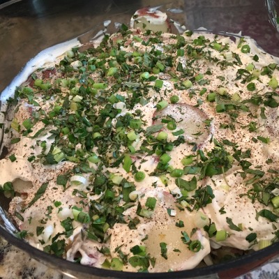 In large bowl start a layer potatoes slices, then salt and paper. Add thin layer of mayo/sour cream mixture. Sprinkle with green onions and parsley. Repeat this layering until bowl is full. Top salad with any leftover mayo mixture, green onions and parsley.