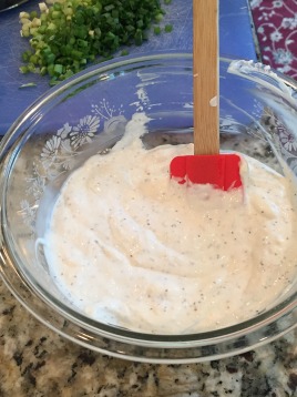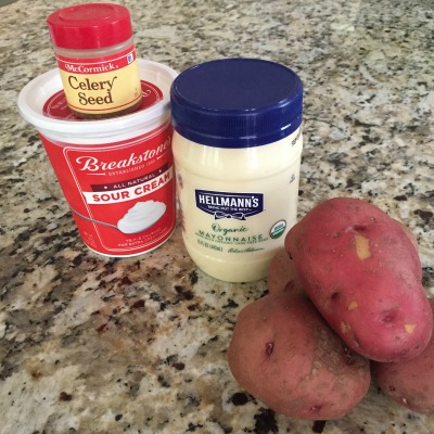 While Potatoes are cooling, mix together Hellman’s Organic Mayo, Sour Cream, Horseradish and celery seed together, keep in the fridge until you need it.
