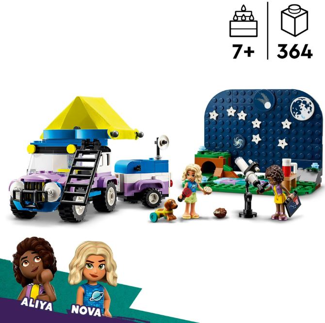 This set has 2 builds in 1 – LEGO Friends Adventure Camp Archery Range 42622 and LEGO Friends Stargazing Camping Vehicle 42603. The sets include 4 mini-dolls, Pickle, a hedgehog and raccoon figure, with 521 total pieces.