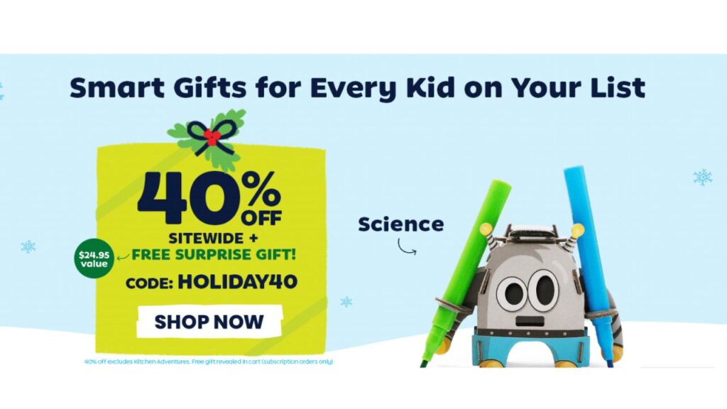 For a limited time only, they’re offering 40% off any subscription plus free shipping and free surprise gift with our coupon code!