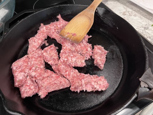 The first step is to cook the sausage, crumble it, and drain the grease.