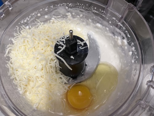- Add the cottage cheese, egg, 1 cup Italian cheese, 1/4 cup Parmesan cheese, salt, garlic powder, and parsley to a food processor and puree.