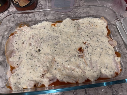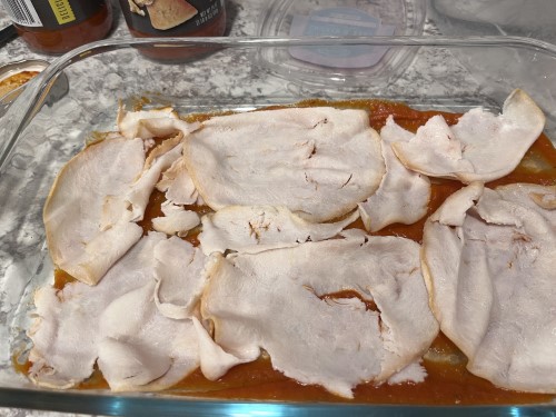 - In a 9x13 pan, spread a couple spoonfuls of pasta sauce on the bottom of the pan, and then lay half of the chicken slices over the sauce.
