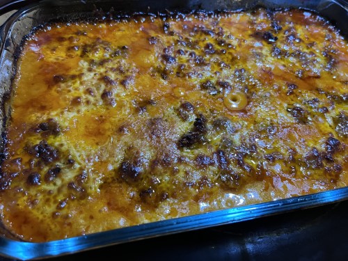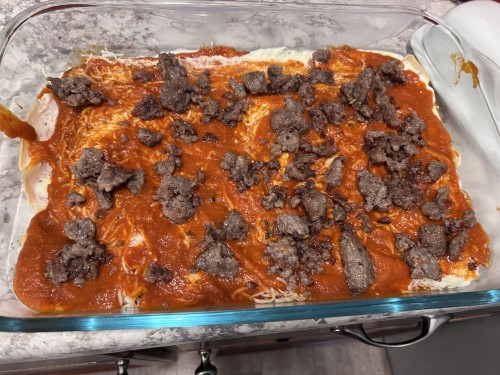 - Finish the layers with the rest of the sauce (about 1 cup) and 1.5 cups of mozzarella cheese.