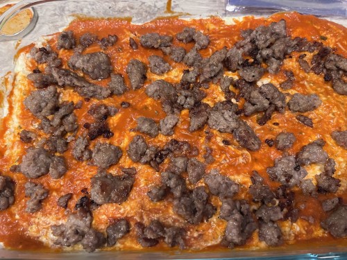 - Spread the rest of the cottage cheese mixture and sprinkle with 1 cup of Italian cheese. Then add the rest of the sausage.