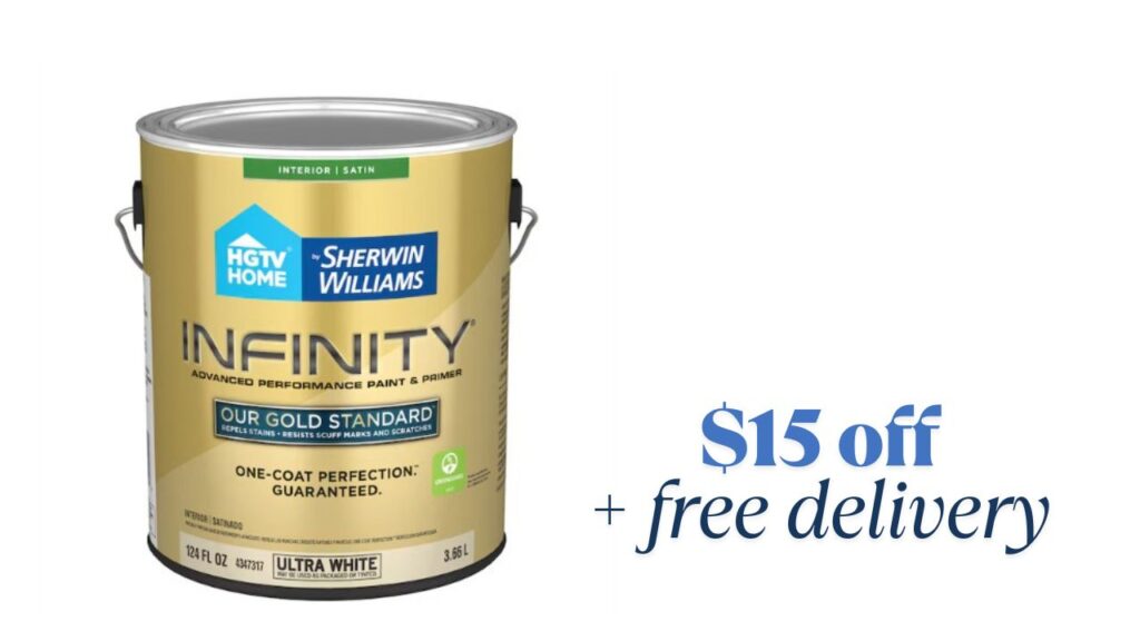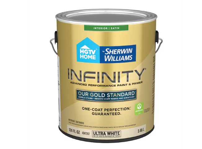 HGTV HOME by Sherwin-Williams Infinity Satin Ultra White Tintable Latex Interior – $50.98 (reg. $65.98)