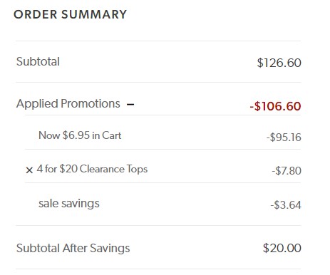 To get this offer, add (4) clearance tops to your cart and enter code 4FOR20. This includes blouses, sweaters, tees and more!