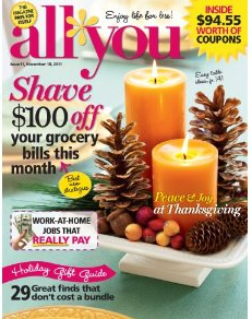 Lots of magazines have a few random coupons each month. But NO magazine compares to the amount of manufacturer coupons in All You Magazine! For $1.25 an issue you get a ton of coupons (sometimes up to $100). Think of this as another Sunday paper (with different coupons!) that only comes once a month.