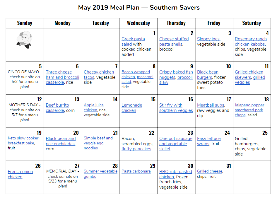 You’ll also see that there are three “special” days this month where you might want to do something a little extra special. We’ll have unique posts with lots of recipe ideas for Cinco de Mayo, Mother’s Day, and Memorial Day, so be sure to check back!