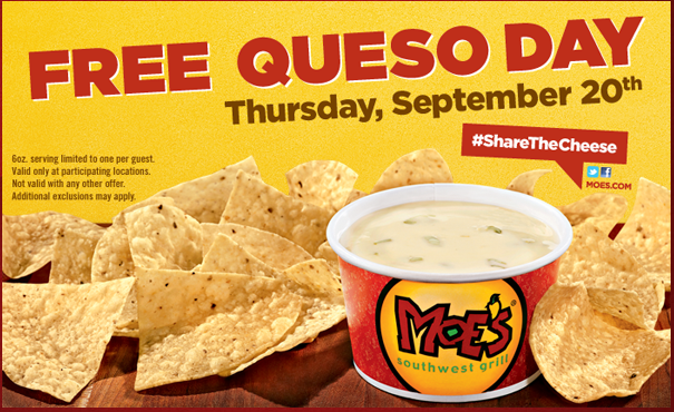This Thursday, 9/20, Moe’s is giving away free 6 oz cups of queso at participating locations with no purchase necessary.