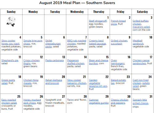August 2019 Monthly Meal Plan