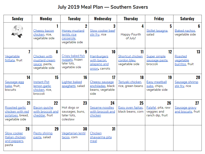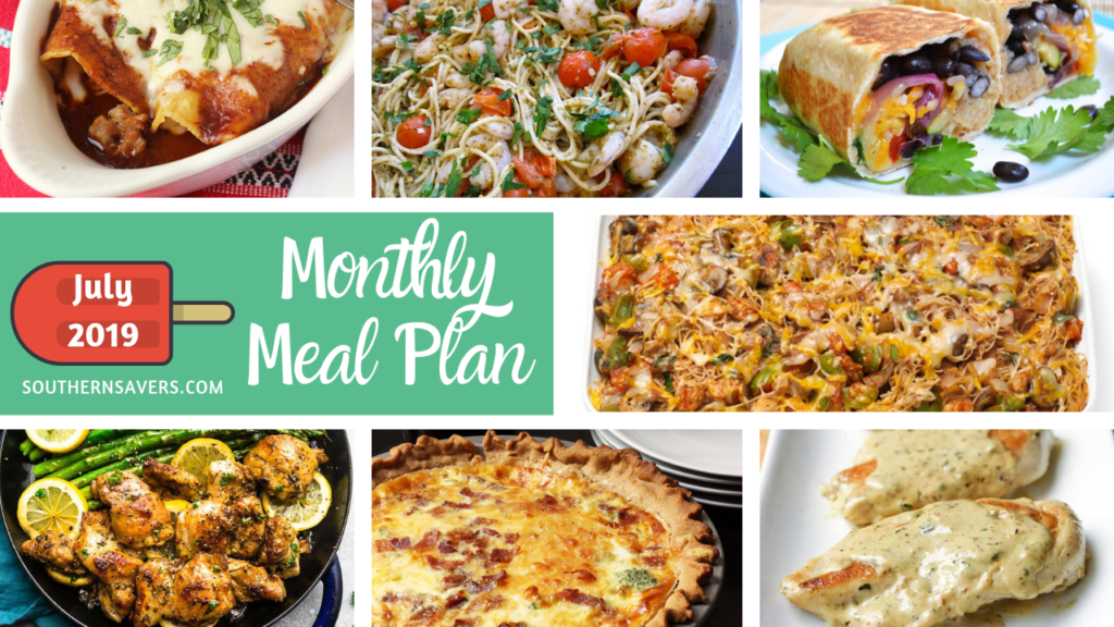 We’re starting the month off a recipe that my kids LOVE: Cheesy Bacon Chicken—I mean, what’s not to love about those three ingredients? You’ll be on your own for the Fourth of July, but you can check out one of our Fourth of July Menu Plans if you need some ideas. Later in the month, we’ll be having Bobby Deen’s lighter baked spaghetti, and we’ll round out the month with a recipe I recently shared here at Southern Savers for Chicken Shawarma.