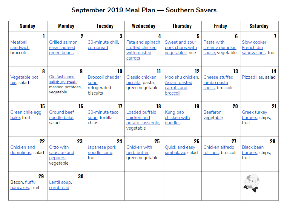 September 2019 Monthly Meal Plan