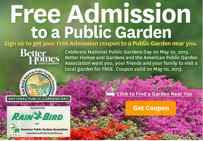 Celebrate National Public Gardens Day, Friday May 10th. Bring your family to a participating Botanical Garden, Arboretum or other public garden for Free when you fill out a form on the Better Homes and Gardens Website.