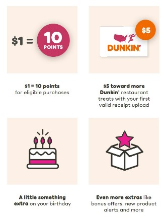 It’s free to join the program, and you get automatically start with 30 points. When you upload your first receipt, you will receive a $5 egift card for use at Dunkin’ shops.