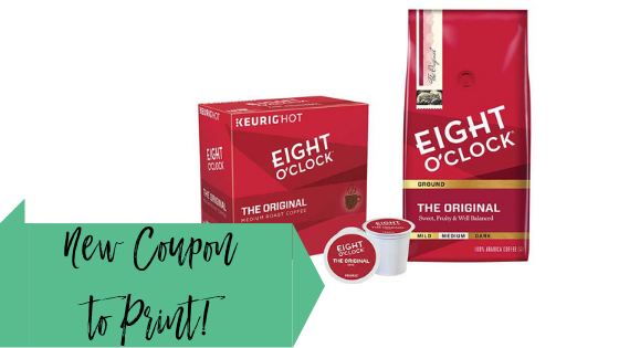 Heads up on a new $2.25/2 Eight O’Clock Coffee coupon to print! This makes for some great deals on bagged coffee and k-cups at several different stores.