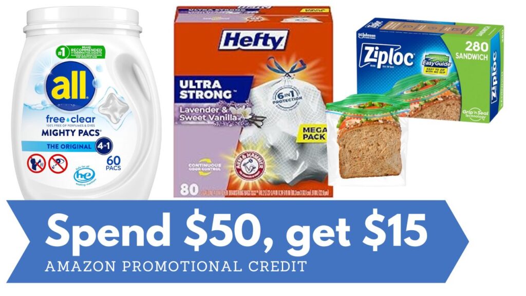 Buy $50 in everyday essentials and get a $15 Amazon Credit. There are 1000+ items to choose from. Grab paper products, cleaning items, trash bags, detergent and more!