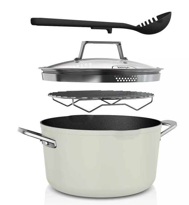 This go-to pot replaces 12 cooking tools, including a stock pot, Dutch oven, saucepot, roasting pan, baking dish, strainer, braiser, deep fryer, spoon-ladle, serving dish, steamer, and lid.