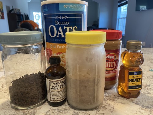 You just need oats, flaxseed, vanilla, peanut butter (or any nut butter), honey, and mini chocolate chips.
