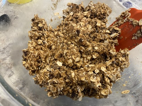 Use a silicone spatula or wooden spoon to mix so that it doesn’t stick too much. If the mixture is too wet, add a bit more oats or flaxseed. If it’s too dry, add a bit more honey.