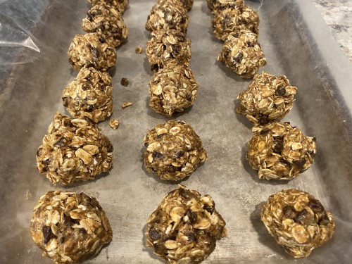 I use a tablespoon scoop to get the mixture out and use your hands to roll them into balls. Pro tip: If the mixture is getting stuck to your hands, get your hands just a little bit wet.