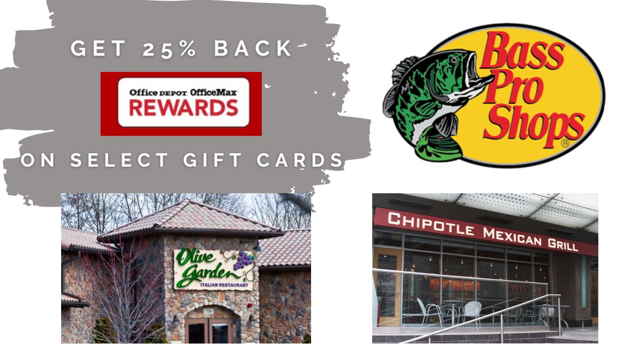 Qualifying gift cards include: Bass Pro Shops, Brinker, Chipotle, Darden Restaurants, JCPenney, or Spafinder.