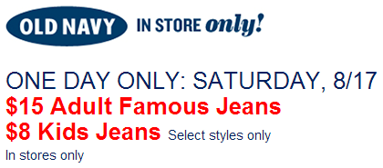 old navy saleHeads up! Tomorrow, 8/17, only Old Navy is having a one day sale on jeans. You can get Adult Famous Jeans for $15 and kids jeans for $8.