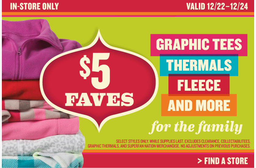 If you need some last minute gifts Old Navy has some great $5 steals! The steals are available in-store only from 12/22-12/24.