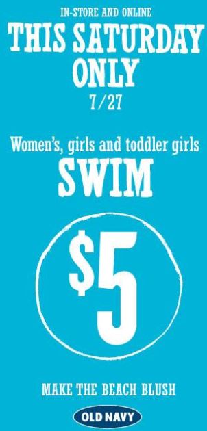 old navy swim saleMake sure to visit Old Navy tomorrow, 7/27, to get $5 Swimsuits for women, girls, and toddlers!