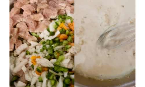 - Add the diced chicken, onion, bell pepper, and carrots, season with salt and pepper, and cook until browned, about 7 minutes. Add the garlic and cook for an additional minute.