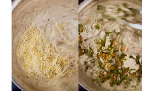 - Stir in the shredded cheese and add the chicken and veggies back to the skillet. Stir to make sure everything is incorporated and serve.