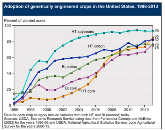 2. Over 85% of our corn crops are genetically modified. Some varieties of corn GMOs turn the plant itself into a pesticide. If an insect eats that variety of corn, the insect will die. That same corn (Bt-corn) is used in our cereals and is registered with the EPA as a pesticide.