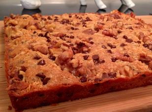 Preheat oven to 325º F. In an 8×8” baking pan, add 1 stick butter or 8 ounces coconut oil. Place in oven until melted. Remove. Add sugar and maple syrup and stir until evenly blended. (A flat-bottom whisk is perfect for this task.) Add egg and vanilla extract. Mix until smooth. Add flour and salt. Mix. Add half of your “stuff”. Mix. Now spread it out evenly and top with the other half of your “stuff” making sure that chocolate and butterscotch chips land on the top so they can melt over everything else. Bake for 20-25 minutes. Remove and let cool. Transfer to a cutting board and cut, removing crusty edges if you want. Optional: lightly drizzle with melted chocolate (chocolate chips + a dab of coconut oil) and toffee (equal parts butter and sugar cooked slowly to 280º F).