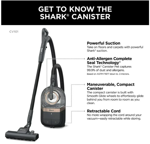 This Shark vacuum features an ultra-lightweight canister with wheels that can easily be moved from room to room. It contains a removable dust cup that you can empty and replace in seconds. An extended reach wand allows for easy cleaning of hard-to-reach places, and an upholstery tool makes cleaning furniture a breeze. Also includes a pet crevice tool.