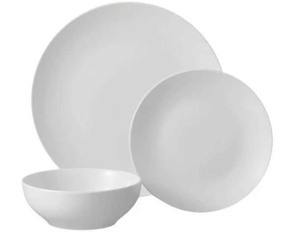 The white porcelain set comes with 4 dinner plates, 4 bowls, and 4 salad plates.