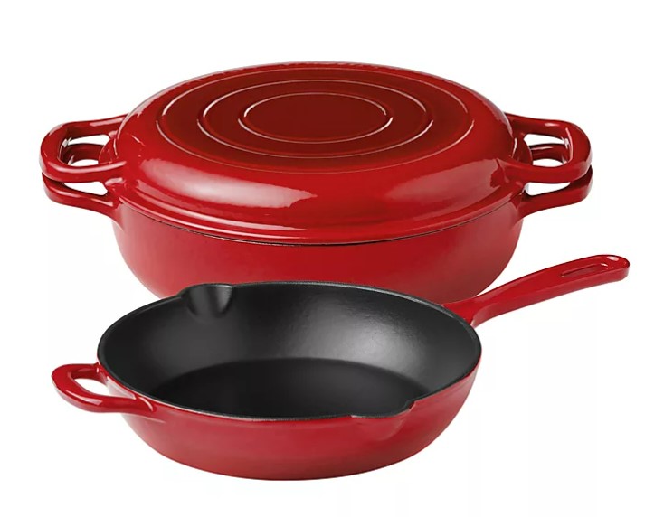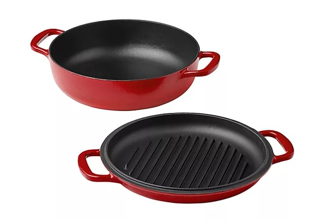This set is offered in five attractive colors! IT includes a 9″ skillet, 4-quart 2-in-1 grill and cocotte.