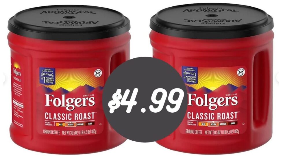 Head over to Staples where you can get Folger’s Classic Roast Ground Coffee 30.5oz Canister for $4.99, regularly $9.99.