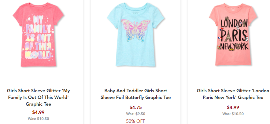 Girl’s graphic tees are between $4.75 and $4.99 right now at The Children’s Place! This sale may not last long, so if you want to stock up shirts for spring and summer, now is the time.