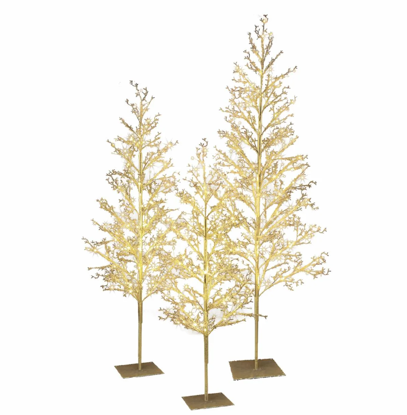 You will get three trees – 4-ft, 5-ft, and 6-ft – each with warm white twinkling lights.