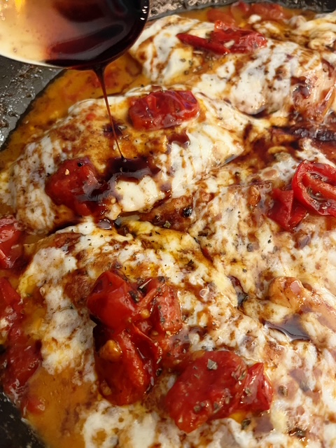 This caprese chicken recipe is super flavorful and comes together quickly! Combine chicken with tomatoes, mozzarella, and a homemade balsamic glaze.